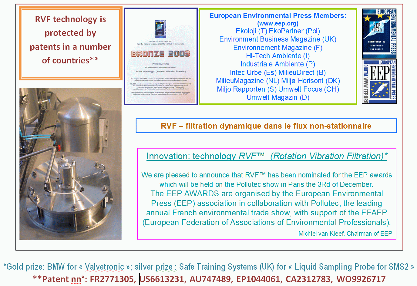RVF technology is a winner of the 3rd prize of the European Environmental Press 2003 (www.eep.org)